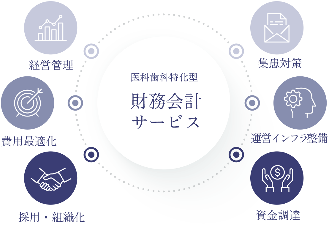 医院・歯科医院様の経営課題を解決するために、専門の税務会計を行います。医療経営戦略に沿った財務会計、人事採用、集患運営、分院承継展開など、医院・歯科の成長フェーズに従って様々な税務サービスを提供できます。