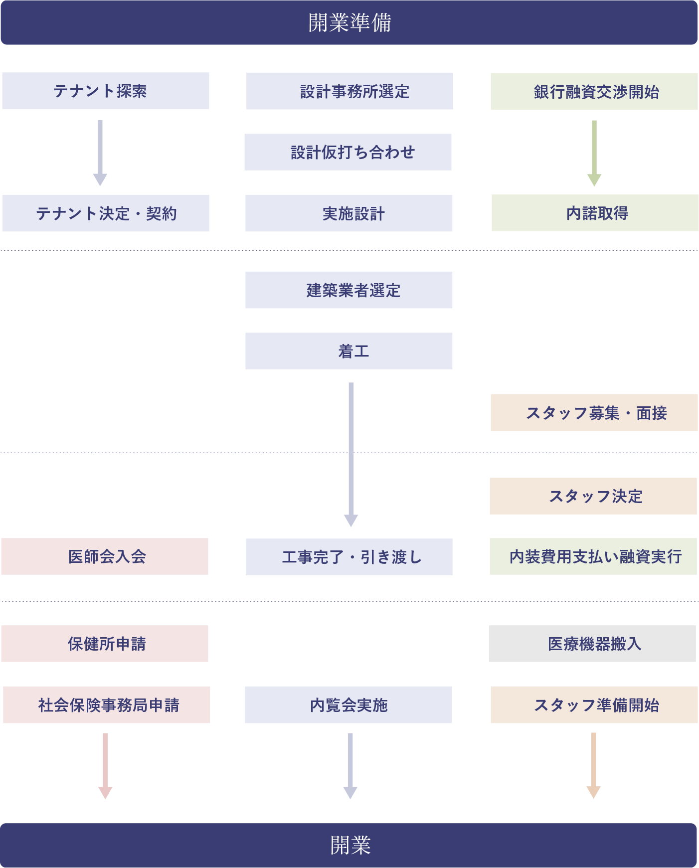 . 開業スケジュールは、ビルテナントや医療モールでの開業では不動産賃貸借契約を結んでから最低6ヶ月、土地を取得して戸建開業の場合は約1年程度で開業となります。物件取得、医療機器の搬入、また資金調達や人材調達、WEBサイト制作など、様々な用意があるため時間がかかります。開業準備や協力業者との連携がスムーズに進むようスケジュール管理を行い、医院様をサポートいたします。